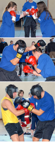 Mit einer gleichermaßen informativen wie witzigen Vorführung eröffnete eine siebenköpfige Box-Delegation das Kampfsport-Spektakel. Hier zeigten Kinder und Jugendlich wie Grundschritte des Boxens angesetzt werden und mittels Pratzentechnik erste Schläge erlernt werden. Trainer Jens Gausmann, der sich der jungten Boxschüler unermüdlich annimmt, demonstrierte zudem mit seinem sechsjährigen Sparringspartner erste Schlagkombinationen, die auch schon die "Kleinsten" ausführen können. Für Furore sorgte ein Boxkampf über drei Runden, in dem sich Ertan Poplata aus der blauen und Reinhardt Kreiner aus der roten Ecke gegenüber standen. Beide Kämpfer trainieren seit zwei Jahren regelmäßig in Egelsbach und freuten sich schon lange auf die Gelegenheit ihr Können unter Beweis zu stellen. Das Publikum bildete das Kampfgericht und votete mit viel Applaus für die gekonnt angebrachten Rechts-Links-Kombinationen beider Kämpfer. Auch Abwehrblocks und Aufwärtshaken wussten beide Kämpfer taktisch einzusetzen, so dass am Kampfende ein unentschieden durch Kampfrichter Marcus Geiss verkündet wurde.