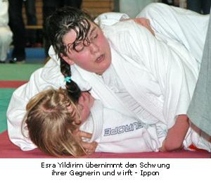 Esra Yildirim, fast schon ein alter Hase auf der Wettkampfmatte, traf in Rimbach erstmals auf eine Gegnerin, die ihr gewichtsmäßig weit überlegen war. Trotz guter Leistung musste sie den Sieg ihres ersten Turnierdurchgangs der Konkurrentin überlassen. Dadurch nicht resigniert, sondern eher noch angespornt, ließ Esra allen weiteren Widersacherinnen keine Chance, entschied alle Kämpfe durch bravouröse Ippon für sich und konnte am Turnierende den Pokal für den zweiten Platz mit nach Hause nehmen.