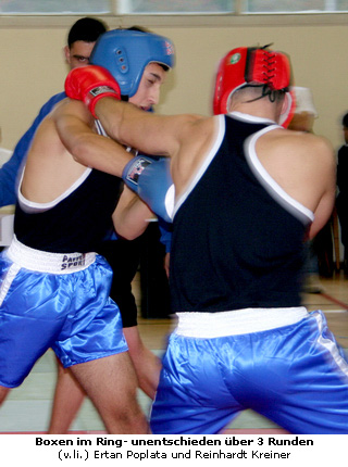 Mit einer gleichermaßen informativen wie witzigen Vorführung eröffnete eine siebenköpfige Box-Delegation das Kampfsport-Spektakel. Hier zeigten Kinder und Jugendlich wie Grundschritte des Boxens angesetzt werden und mittels Pratzentechnik erste Schläge erlernt werden. Trainer Jens Gaussmann, der sich der jungten Boxschüler unermüdlich annimmt, demonstrierte zudem mit seinem sechsjährigen Sparringspartner erste Schlagkombinationen, die auch schon die "Kleinsten" ausführen können. Für Furore sorgte ein Boxkampf über drei Runden, in dem sich Ertan Poplata aus der blauen und Reinhardt Kreiner aus der roten Ecke gegenüber standen. Beide Kämpfer trainieren seit zwei Jahren regelmäßig in Egelsbach und freuten sich schon lange auf die Gelegenheit ihr Können unter Beweis zu stellen. Das Publikum bildete das Kampfgericht und votete mit viel Applaus für die gekonnt angebrachten Rechts-Links-Kombinationen beider Kämpfer. Auch Abwehrblocks und Aufwärtshaken wussten beide Kämpfer taktisch einzusetzen, so dass am Kampfende ein unentschieden durch Kampfrichter Marcus Geiss verkündet wurde.