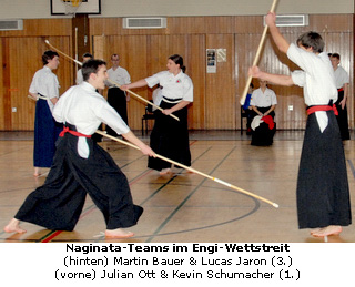 Dank einer großzügigen Spende der Stadtwerke Langen konnten alle Naginatakämpfer mit Medaillen für ihre guten Leistungen belohnt werden. Bei der Siegerehrung die vom 2. Vorsitzenden der SGE Wolfgang Adam und dem stellvertretenden Abteilungsleiter Andreas Malitz vorgenommen wurde, erreichte das Team Michael Kammerer und Markus Wunder, der erst seit wenigen Monaten zur Truppe der SGE gehört, einen guten zweiten 3. Platz. Das Team Martin Bauer und Lucas Jaron erreichte 10 Punkte und nahmen Bronze für ihre Ausführung der verlangten Engi-Formen entgegen. Für Überraschung sorgte das junge Team Falk Steitz und Yanis Mohr, als es sich mit einer Unterbewertung von 15 Punkten den 2. Platz sicherte. Erste des Turniers wurde das Team Kevin Schumacher und Julian Ott. Mit äußerster Konzentration und der nötigen Ruhe setzten die beiden Kämpfer ihre Schläge an und trafen Punkt genau alle Trefferstellen. Das Team erhielt zudem den Titel "Vereinsbeste 2009" und wird diesen beim den 4. Kampfsporttagen Ende November 2010 verteidigen müssen.