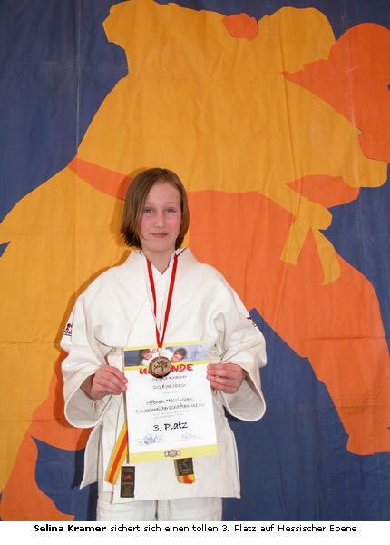 Selina Kramer (-43 Kg), die von den schwierigen Kampfbedingungen ihrer Vereinsmitstreiter erfahren hatte, nahm es sportlich und malte sich keine großen Medaillenchancen bei ihrem U13-Debüt am Sonntag aus. Sie nahm sich vor ihre Techniken durch zu probieren, um so gut in die neue Saison zu kommen. Sie startete in einer 13 Kämpferinnen starken Gruppe mit 10 Punkten und gewann mit weiteren 10 Punkten, mittels Ippon durch einen sauberen Hüftwurf (O-goshi), innerhalb von 6 Sekunden gegen Marie-Charlotte Frankenberg vom JC Frankfurt. Trotz Kampfverlust gegen Kimberly Hertling vom JC Bürstadt, bei der sie sich falsch herum aus einer Bodenhalte in einen Streckhebel drehte, hatte Selina Blut geleckt und hatte nun doch einen Podestplatz im Visier. Kampfmutig und mit Biss ging sie ins kleine Finale gegen Samana Tabibi vom Samurai Bürstadt und kickte ihre Gegnerin, mit einem Fußsturz (O-soto-otoshi) und zwei kleinen Hüftwürfen (Uki-goshi), aus den Medaillenrängen. Die Egelsbacherin holte sich verdient ihre erste Bronze-Medaille in diesem Jahr und feierte ausgiebig den Meisterschaftserfolg auf Hessischer Ebene mit ihrer SGE-Abteilungsleiterin.