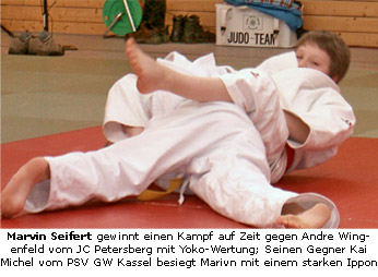 Dies traf auch das angetretenen Judo-Duo der Sportgemeinschaft Egelsbach am ersten Wettkampftag hart, da ihr Coach Jürgen Krist nicht ständig in beiden Kampfstätten zu gleich sein konnte. Der Turnierjüngste der SGE Emanuel A. (-40 Kg), der seinen erste Kampf willenstark gewann, verpasste nach einer knapp verlorenen Mattenpartie den Einzug in die Trostrunde, da er schlichtweg den Aufruf seines dritten Kampfes nicht hörte. Bei einer Gruppenstärke von 23 Teilnehmern platzierte er sich in der zweiten Hälfte seiner Gruppe. Marvin Seifert (-34 Kg) traf in seiner Gewichtklasse gleich auf 31 Kontrahenten. Schon etwas länger im Turnierbetrieb unterwegs, konnte Marvin Kampf und Technik stark zwei Kämpfe für sich entscheiden und sich den 5. Platz in seinem Pool sichern.