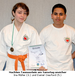 Mit Kampfeslust und Biss ging am Samstag, dem 13.03.2010, die U17 an den Start. Daniel Crawford (-73 kg) durfte seine erlernte Technik im Jeder-gegen-Jeden-Modus erproben und erreichte einen guten 5. Platz in seiner Gewichtsklasse. Ina Müller (-63 kg), die sich am Donnerstag zuvor am Rücken verletzte, wollte sich die Chance auf eine Medaille nicht entgehen lassen und trat trotz Bedenken ihres Trainers Jürgen Krist in Taunusstein an. Sie konnte durch einen Haltegriff gegen Ayleen Kinder vom JC Bushido Wüstems, mit Waza-ari im kleinen Finale punkten und holte sich Bronze für ihren mutigen Einsatz.