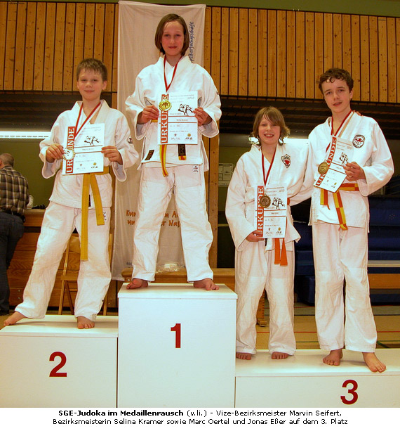 Jonas Eßer, der erst neu im SGE-U14-Kader zu Hause ist, konnte bei der Bezirksmeisterschaft in Bürstadt zwei seiner vier Kämpfe für sich entscheiden. Er holte, mit einem Yuko gegen Dominic Lang (TG Rimbach) und einem gerade erst erlernten Hebel gegen Oktay Sönmez vom JC Überwald, Bronze in der Gewichtsklasse bis 50 Kg.