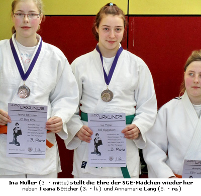 Nach der Pleite der U14er-Mädels aus Egelsbach griff Ina Müller (-70 kg) in der Altersgruppe U17 ins Turniergeschehen ein. Ina konnte sich im Jeder-gegen-Jeden Modus gleich zweimal behaupten und punkte gegen Kontrahentinnen aus Ludwigshafen und Bad Ems mit Ippon. Zumindest eine Medaille konnten die SGE-Mädels an diesem Turniertag für sich verbuchen - die für den 3. Platz von Ina Müller.