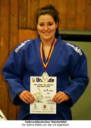 Noch eins drauf legte Selina Malitz, als sie auch am Sonntag, dem 12.02.2012, auf der Südwestdeutschen Meisterschaft in der Altersklasse U20 in Heusweiler an den Start ging. Angefeuert von einer ganzen Delegation aus Egelsbach - ihre Vereinskollegen hatten extra den weiten Weg auf sich genommen, um Selina zu überraschen und zu unterstützen - schlug sich die 15-Jähre wacker. Ihre ersten Mattenbegegnung an diesem Wettkampftag gegen die spätere Vizemeisterin Katharina Stube aus dem Rheinland (SV Urmitz) verlor die Egelsbacherin unglücklich. Nicht demotiviert setzte sich die Südhessin dann jedoch in der Trostrunde gegen die Pfälzerin Katrin Engel vom TV Rodenbach mit einem sauberen Ko-soto-gake (Kleiner Außeneinhänger) durchsetzen, erzielte den gewünschten Ippon-Sieg und zog ins Kleine Finale ein. Beim Kampf um den dritten Platz, konnte Selina ihren Tani-otoshi (Talfallzug) nicht ganz sauber ansetzten, wurde gekontert und musste sich Damaris Klinder (Bushido Wüstems) geschlagen geben.