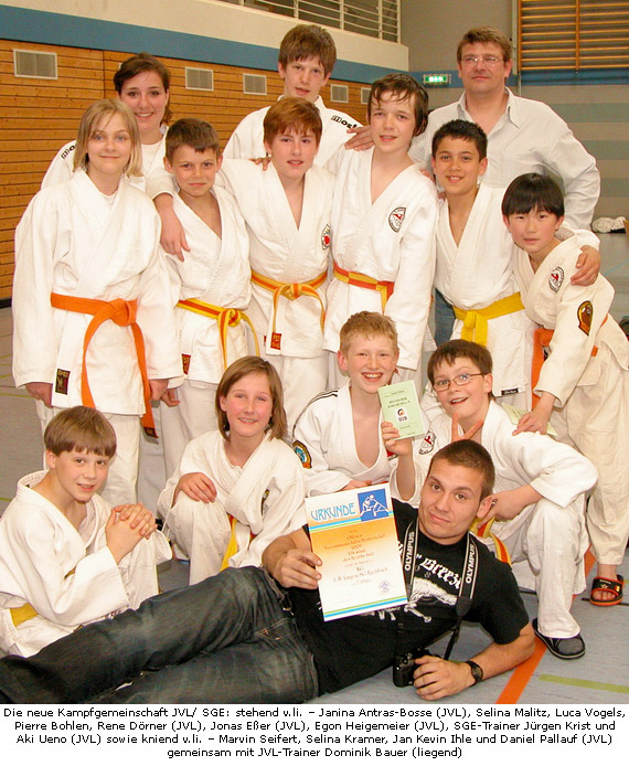 Am 25. April 2009 waren die Judokas der Altersklasse U14, als Kampfgemeinschaft der SG Egelsbach und des 1. Judo-Vereins Langen, gemeinsam zur Bezirks-Mannschaftsmeisterschaft Süd in Rimbach (Odenwald). Obwohl bei den Jungs 2 und bei den Mädchen 5 Gewichtsklassen von uns nicht besetzt konnten, begannen die Kämpfe bei den Jungs spektakulär. Aki Ueno (-34 kg), kleinster der Mannschaft, errang sofort die Oberhand im Kampf und gewann mit einem Ippon durch einen Juji-gatame (Hebel). Der Judoka Egon Heigemeier (-40 kg) gewann zwei Kämpfe. Pierre Bohlen (-46 kg) schied nach erstem gewonnenen Kampf, durch eine schwere Verletzung des Fußes, aus. Das Schlusslicht Rene Alexander Dörner (+55 kg) war kraftvoll und durchsetzungsfähig. So gewann er gleich alle seine Kämpfe bravourös. Seinen letzten Kampf beendete er vorzeitig, schon nach 40 Sekunden, mit Tajotoshi (Körperwurf) und einem Ippon. Die männlichen Judokas waren insgesamt stark motiviert und hatten kraftvoll, nach dem Motto der Musketiere, gekämpft.