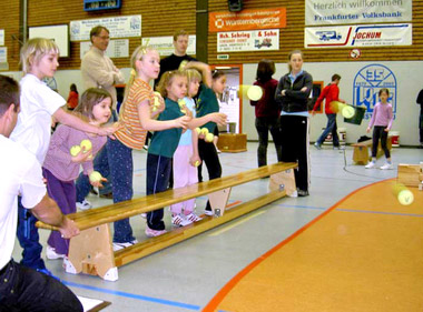 Der Wettbewerb hatte viele Facetten, dazu gehörte Laufen, Springen und Werfen in kindgerecht umgesetzen Disziplinen. Es galt durch Pappkisten zu springen und durch Fahrradreifen zu laufen, Bälle im Zielweitwurf in Fässer zu bringen, beim "Ringe weit Flug" so weit wie möglich in der Luft zu fliegen u.v.m. Spaß hatte hier jedes Kind das mitgemacht oder zugeschaut hatte.