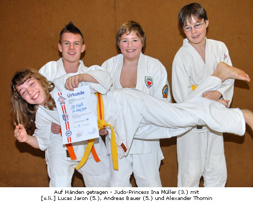 Die Mannschaft der SGE, die wegen Heimvorteil nicht in die Wertung "Bester Verein" einging, heimste siebenmal Gold, acht Silbermedaillen und elf bronzene Auszeichnungen ein. Einen guten dritten Platz belegten in der U11 Jorina Eckert (-45,5 kg), Lisa Meißner (-28,4 kg), Marvin Seifert (-26,8 kg), Felix Stiglbauer (-31 kg), Ruben Kramer (-31,5 kg), Julian Santos Abad (-38,6 kg) und Felix Luft (-49,8 kg). In der Alterklasse U14 konnten Rene Bermond (-47 kg), die Zwillinge Dominik und Pierre Bohlen (-50,5 kg) sowie Alexander Thomin (-65,2 kg) gleichfalls einen tollen 3. Platz für sich verbuchen. Schon höher auf das Siegerpodest, nämlich auf den zweiten Platz, stiegen in der Altergruppe U11 Celina Evertse (-33,6 kg), Celina Genedy (-45,5 kg), Vanessa Trackl (-51,5 kg), Luca Vogels (-31 kg) und Tim Heidinger (-34,6 kg). Ebenfalls einen starken 2. Platz erkämpften Tamara Kunz (-44,3 kg), Ina Müller (-47 kg) und Natnael Tekeste (-50,5 kg) in ihrer Altersklasse U14. Für ihre spitzen Leistungen wurden in der U11 Nesthäkchen Helin Aygül (-28,5 kg), Selina Kramer (-45,5 kg), Laura Cezanne (-51,5 kg), Samuel Santos Abad (-29,5 kg) und Jan Kevin Ihle (-33,5 kg) mit glänzendem Gold ausgezeichnet. Kathrin Grudzinski (-44,3 kg) und Shawn Dullinger (-39,5 kg) stellten die Ehre der SGE in der Altersklasse U14 her und belegten sich für ihre hervorragenden Kampfeinsätze am Wettkampfende auf dem 1. Platz.