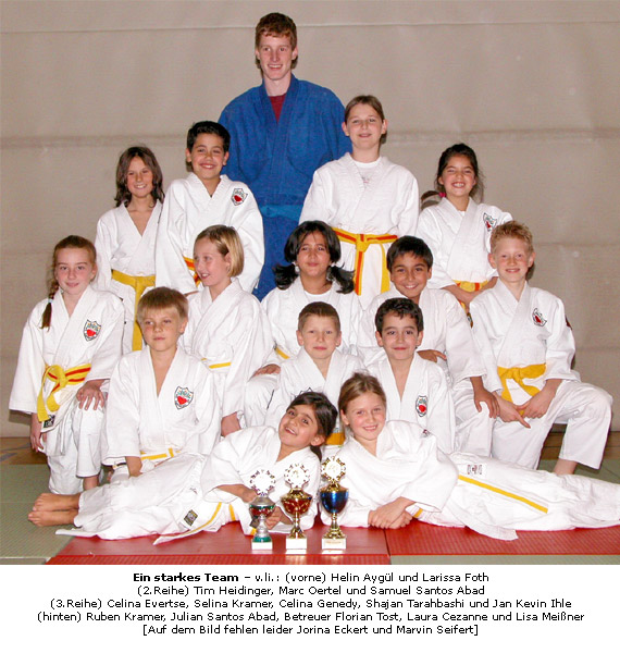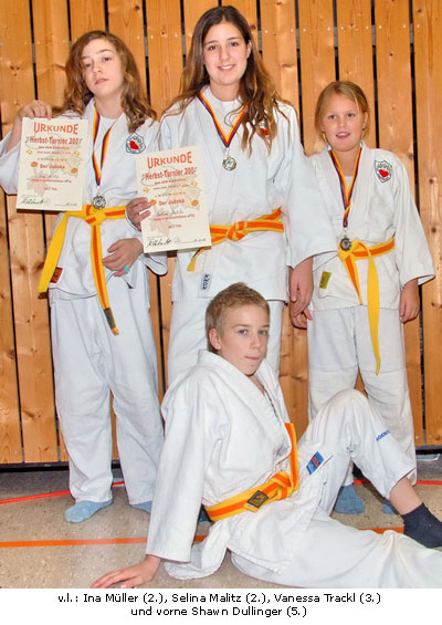 Die Judoka mit gelb und gelb-orange Gürteln standen kampfbereit am zweiten Turniertag (04.11.07) auf der Matte. Lisa Meißner, Samuel Santos Abad und Ruben Kramer konnten sich in ihrer Kampfgruppe beweisen und den 3. Platz erringen. Starke Gegner hatten auch Celina Evertse und Julian Santos Abad. Sie erreichten den 2. Platz durch ideenreich umgesetzte Kampftechniken. Ebenfalls eine Urkunde über den 2. Platz erhielten die Turnier-Newcomer Marc Oertel und Jan Kevin Ihle. Beide konterten die Angriffe ihrer Gegner und verblüfften mit vortrefflich umgesetzten Rechts-Links-Angriffen. Siegerin ihrer Gewichtsklasse wurde Laura Cezanne. Mittels Ippon konnte sie nach einem zähen Kampf, mit Verlängerung, ihren Kontrahenten bezwingen. Auch an diesem Wettkampftag wurden die besten Mannschaften ermittelt. Obwohl die Mädchengruppe aus Egelsbach sehr klein war, konnte sie sich gegen ihre Konkurrentinnen durchsetzen und erhielten den Pokal in Silber für die beste Mädchenmannschaft.