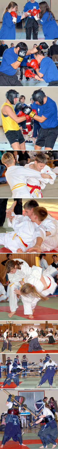 Für immensen Aufruhr sorgte ein weiterer Programmpunkt der Jubiläumsveranstaltung. Die Gäste des Kampfsporttages kamen erstmalig mit einem weiteren Highlight des Budo-Sport in Berührung: Naginata. Der japanische Kontaktkampfsport wurde von der neuen SGE-Naginatagruppe mit Unterstützung von Naginataka aus Frankfurt, Mainz und Wiesbaden in einer aufregenden Darbietung präsentiert. Dem faszinierten Publikum wurde die meditative Kata-Form sowie der ekstatische Kampf der Schwerlanzen-Ritter der alten Samurai-Tradition eindrucksvoll vermittelt. Etliche vom Naginata-Geist beseelte Beobachter waren so bezaubert, dass sie sich direkt nach der Präsentation in den ersten Egelsbacher Anfängerkurs im Januar 2008 einschrieben.