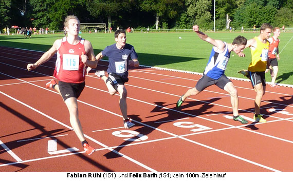 Besonders hervorzuheben sind die persönlichen Bestleistungen von Fabian Rühl und Felix Barth. Fabian Rühl lief die 100m in 11,98s. Er musste sich nur Steffen Schattner vom ASC Darmstadt geschlagen geben und wurde für seine Leistun mit einem tollen 2. Platz geehrt. Felix Barth wurde mit 12,12s Vierter. Ihm fehlten zum dritten Platz gerade einmal 0,04s. Im 200m-Lauf konnte Fabian Rühl seine persönliche Bestleistung um phantastische drei Zentel verbessern. Mit 23,94s fehlten ihm nur 0,02s zum dritten Platz. Im Weitsprung konnte Felix Barth mit persönlicher Bestleistung von 6,06m im ersten Versuch dem 3. Platz sichern.