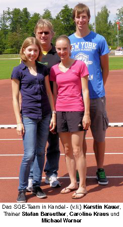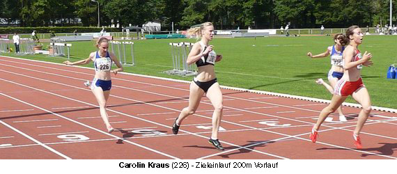 Die Sprinterin Carolin Kraus startete dieses Mal über die halbe Stadionrunde. Aus fünf Vorläufen qualifizierten sich die zwölf Zeitschnellste für den A- und B-Endlauf über 200m. Mit verbessertem Start und einem guten kämpferischen Lauf erreichte Carolin nach 25,55s das Ziel. Sie konnte sich damit gut gegenüber den dreißig Kon- kurrentinnen behaupten, verfehlte die Endläufe allerdings knapp. Um sich in den nächsten Jahren weiter in der Spitze der Deutschen Sprinterinnen verbessern zu können ist weiterer Muskelaufbau dringend erforderlich. Im Hochsprung der Junioren hatten lediglich dreizehn Springer mit Qualifikationshöhen von 2,02m und höher gemeldet. Unter den Sprin- gern war auch Michael Werner von der SGE der exakt diese Höhe in diesem Jahr bereits gemeistert hatte. Ein wenig beeindruckt von den Top-Springern konnte er auch bei dieser Veranstaltung seine Anlaufschwierigkeiten der letzten Wochen nicht abstellen und wurde mit übersprungenen 1,90m unter Wert geschlagen.