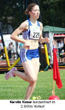 Kerstin hatte sich gezielt auf diesen Wettkampf vorbereitet und war sich über die Stärken der Gegnerinnen bewusst. Sie ging das Rennen von Beginn sehr mutig und schnell an. Auch die 400m-Durchgangszeit von 67 Sekunden war ganz nach Plan. Allerdings musste Kerstin 2 Läuferinnen bei 600m passieren lassen, ohne jedoch den Kontakt zur Spitze zu verlieren. Mit einem starken Finish belegte sie am Ende den 3. Platz und wurde mit der hervorragenden Zeit von 2:16,44 belohnt. Diese Verbesserung von fast zwei Sekunden bedeuten die Qualifikation sowohl für die Deutschen Jugendmeisterschaften in Mönchengladbach als auch für die Deutschen Meisterschaften der U23 in Kandel. Diese Leistung ist um so bemerkenswerter, da Kerstin in dieser Saison noch dem jüngeren U20-Jahrgang angehört.