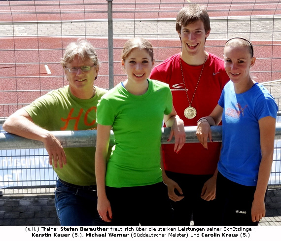 Der Süddeutsche Leichtathletikverband - bestehend aus den Landesverbänden Bayern, Baden-Württemberg, Rheinland-Pfalz, Saarland und Hessen - veranstaltete am 7./8. Juli 2012 seine diesjährigen Juniorenmeisterschaften der U23 in Heilbronn. Von der SG Egelsbach hatten sich Michael Werner im Hochsprung, Carolin Kraus im Langsprint und Kerstin Kauer über 800m für diese Meisterschaften qualifiziert.