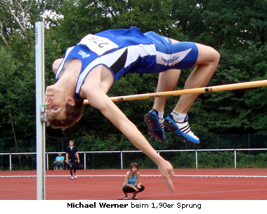 Gut, dass sich am Sonntag die Sonne durchsetzte, der nasse Untergrund trocknete schnell, somit hatten die Hochspringer gute Voraussetzungen für Ihren Wettkampf. Michael Werner ging sehr konzentriert in den Wettkampf. Möglichst keinen Fehlversuch bei den ersten Höhen, war die Order der Trainerin Ulrike Worringer. Das setzte Michael optimal um. Er sprang eine saubere Serie bis 1,95m. Bei 1,98m zögerte er allerdings zu lange im Absprung - holte sich jedoch den wohlverdienten neunten Hessischen Meistertitel. Die Tendenz stimmte und so können die Deutschen Meisterschaften kommen.