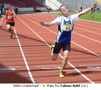 Am Samstag konnte der B-Jugendliche Fabian Rühl, bei nasskaltem Wetter, seine persönliche Bestzeit über 400m um weitere 0,6 Sekunden verbessern. In der nächsthöheren Altersklasse kam er mit 53,15 Sekunden auf Rang 7.