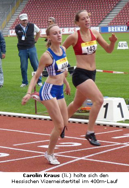 Caro wurde bei den Frauen Vize- meisterin mit neuem Vereinsre- kord von 58,08s. Fabian Rühl wurde für seine fleißige Trainingsarbeit der letzten Wochen belohnt, steigerte seine persönliche Bestzeit um fast eine Sekunde und erreichte mit 53,73s einen für ihn hervorragenden dritten Platz bei der männlichen Jugend B. Als besondere Anerkennung wurde Fabian zum Verbände-Länderkampf der B-Jugend zwischen Hessen, Bayern und Baden Württemberg eingeladen. Dem wollte Kerstin Kauer nicht nachstehen, erreichte ihre persönliche Bestzeit und wurde Vierte in 61,34 bei der weiblichen Jugend B.