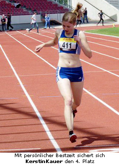 Carolin Kraus startete dieses Mal ausschließlich im 200m-Lauf, was sich positiv auf die erzielte Leistung auswirkte. Mit gelaufenen 25,78s qualifizierte sie sich locker für den Endlauf. Trotz schwachem Start und bei leichtem Gegenwind verbesserte Caro Ihre Bestleistung aus dem Jahr 2009 deutlich und belegte mit einem neuen Vereinsrekord von 25,17s einen guten vierten Platz.