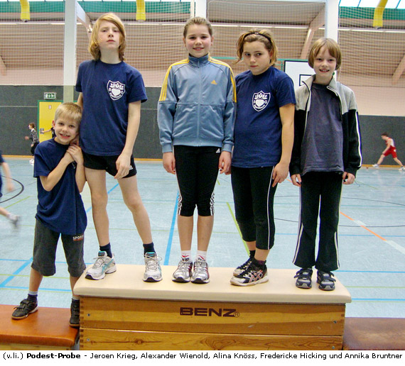 Noch besser schnitten die um ein Jahr älteren Alina Knöss und Fredericke Hicking ab. Alina ergatterte den dritten Treppchenplatz mit 1.038 Punkten (8,52 sec. - 50 Meter / 27,5 m - Ball / 3,20 m - Weit) und Fredericke wurde sehr gute 5. mit 991 Punkten (8,73 sec. / 25 m / 3,18 m) unter 14 Teilnehmerinnen. Beim Ballwurf waren beide Ihren Mitstreiterinnen weit überlegen, und so lagen sie nach dem 50-Meter-Lauf sogar zwischenzeitlich auf den Plätzen eins und zwei. Leider konnten die Spitzenpositionen nach dem Weitsprung nicht gehalten werden. Für diese technisch sehr ausgefeilte Disziplin fehlt halt in Egelsbach im Winterhalbjahr eine entsprechende Übungsanlage, um noch gezielter zu trainieren.