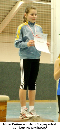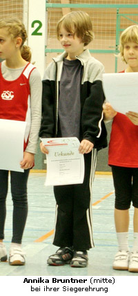 Annika Bruntner konnte mit einer Gesamtpunktzahl von 878 Punkten im Dreikampf in ihrem ersten Wettkampf überhaupt einen beachtlichen 13. Platz unter 25 Teilnehmerinnen erreichen. Ihre erzielten Einzelleistungen von 9,05 sec. über 50 Meter, 15,5 m im Ballwurf und 3,34 m im Weitsprung sind ein tolles Ergebnis.