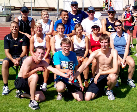 Wer gerade nicht laufen musste, konnte die ganz Kleinen auf der Bahn bewundern und anfeuern, sich prima unterhalten und mit den anderen herumalbern. Besonders stark zeigten sich dabei die Nachwuchssprinter Stefan Kauer, Fabian Rühl und Hochspringer Michael Werner. Platz 2 belegten die Footballer der Langen Knights. Die schnellste aller Runden schafften jedoch die Gazellen in beeindruckenden 58 Sekunden! Alle Sportler hatten an diesem Samstagvormittag viel Spaß und versprachen, nächstes Jahr wieder dabei zu sein! Als Preis gab es für jede Mannschaft einen signierten Äbbelwoibembel. Unserer wird bald den SGE - Sportler-Treff schmücken.