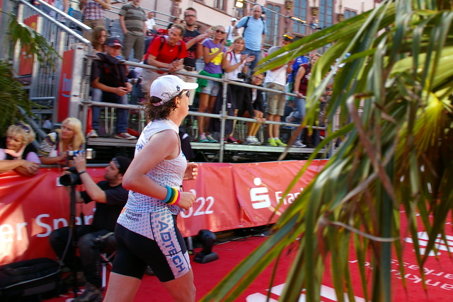 Laufen: Frische, trockene Socken, für alle Fälle doch nochmal Sonnencreme, und ab. Die ersten Kilometer waren ok - tolle Stimmung, großartige Zuschauer und Helfer. Ab km 15 etwa war es aber vorbei - Magenkrämpfe, Magenschmerzen, Ofen völlig aus. Ich brauchte viel Willenskraft, um weiterzulaufen, mit jedem Kilometer mehr. An den Aid Stations nahm ich meistens nur Wasser zu mir, selten etwas Cola, an mehr traute ich mich nicht mehr ran. Ich schleppte mich von einer Aid Station zur nächsten, nahm am Anfang Wasser, ging bis zum Ende, dann Schwämme, und dann wieder "Laufen" bei einer Pace von 7:15 min/km. Erst weit jenseits von km 30 hatte ich das Gefühl, dass sich der Magen soweit erholt hatte, ich verspürte zum ersten Mal ein leichtes Hungergefühl. Jetzt traute ich mich an ein Gel, aber inzwischen war natürlich die körperliche Erschöpfung so groß, dass ich nicht mehr in Schwung kam. Nur eine Blöße wollte ich mir während des ganzen Laufsplits nicht geben: Keine längeren Gehpausen, niemand sollte mir nachsagen können, dass ich Wandertag gemacht hätte oder mein versäumtes Lauftraining jetzt durchschlug. Der Forumsdruck (insb. eines derzeit abwesenden Herren) hielt mich aufrecht - bei Motivation ist es scheißegal, wo sie herkommt ;) Nach 4:45 h durfte ich die 200 m zum Römer hochlaufen, und für diesen Moment waren alle Mühen von mir genommen, ich lief dort hoch, als würden wir uns auf der Laufbahn locker einlaufen ... Wahnsinn.