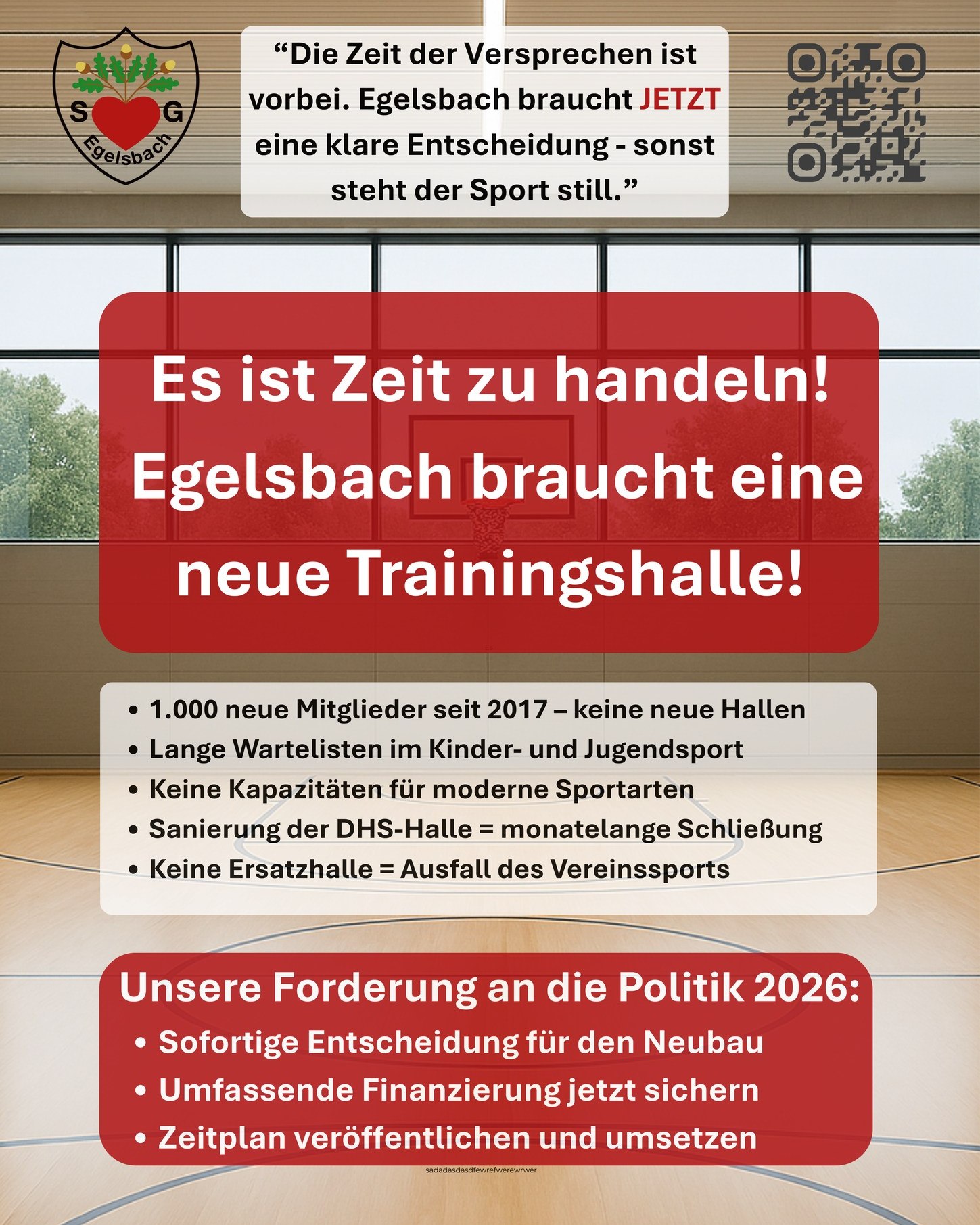 Gleichzeitig steht die energetische Sanierung der Dr.-Horst-Schmidt-Halle an. Diese wird eine 6–12 Monate lange Schließung bedeuten. Ohne Ausweichhalle bricht der Sportbetrieb in Egelsbach weitgehend zusam-men.