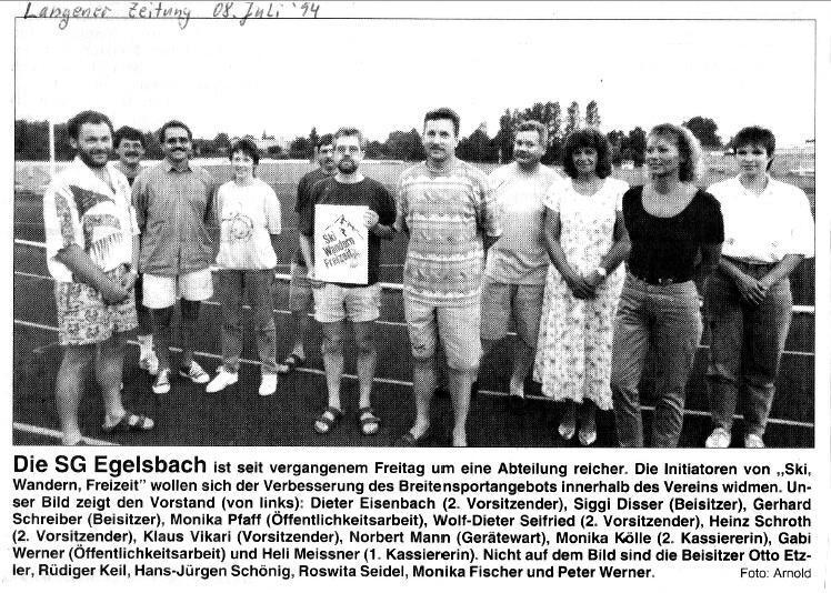Die SG Egelsbach ist seit dem 01. Juli 1994 um eine Abteilung reicher. Die Initiatoren von „Ski, Wandern, Freizeit“ wollen sich der Verbesserung des Breitensportangebotes innerhalb des Vereins widmen.